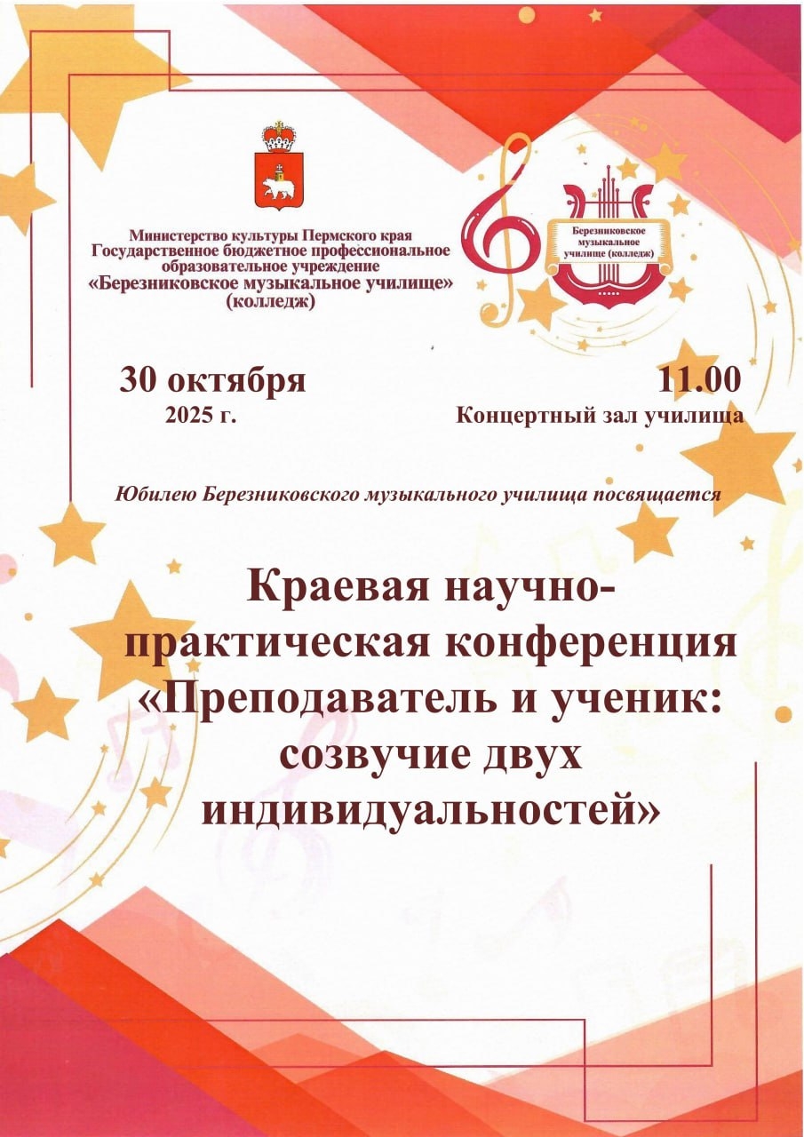 30 октября 2025 года на базе ГБПОУ "Березниковское музыкальное училище" преподаватели ДШИ приняли участие в Краевой научно-практической конференции "Преподаватель и ученик: созвучие двух индивидуальностей".