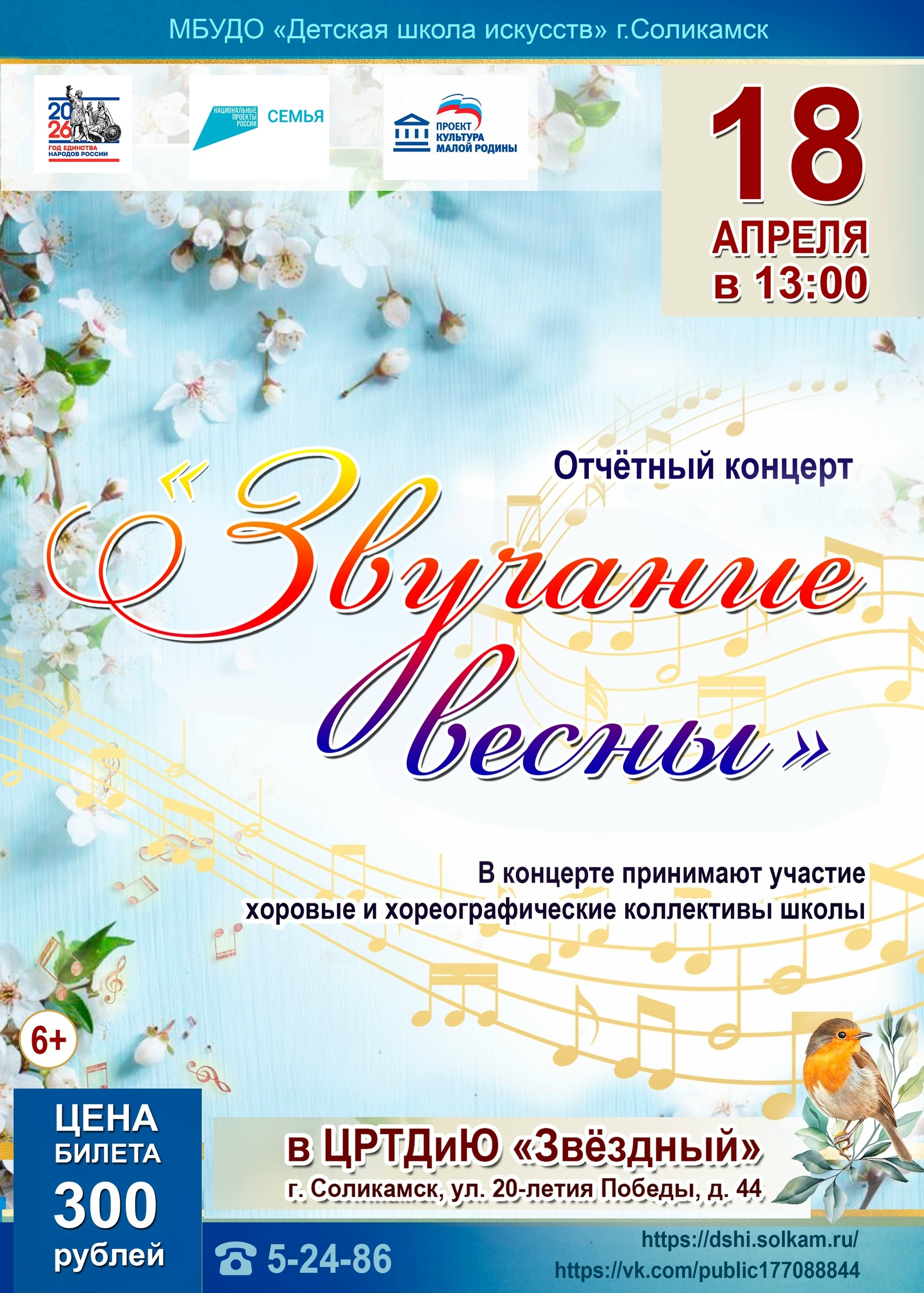 18 апреля 2026г. в 13.00 Детская школа искусств приглашает гостей на отчетный концерт хоровых и хореографических коллективов школы "Звучание весны".